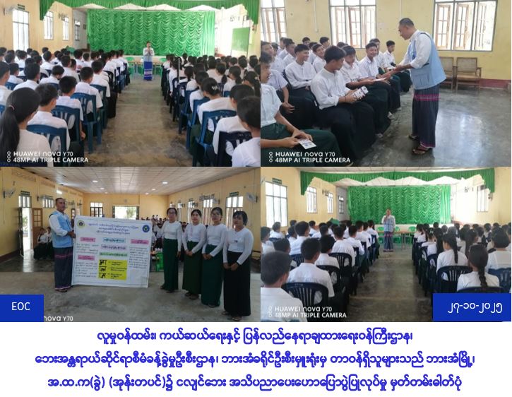 လူမှုဝန်ထမ်း၊ ကယ်ဆယ်ရေးနှင့် ပြန်လည်နေရာချထားရေးဝန်ကြီးဌာန၊ ဘေးအန္တရာယ်ဆိုင်ရာစီမံခန့်ခွဲမှုဦးစီးဌာန၊ ပြည်ထောင်စုနယ်မြေ၊ နေပြည်တော်၊ ဥတ္တရခရိုင်ဦးစီးမှူးရုံးမှ တာဝန်ရှိသူများသည် (၉.၅.၂၀၂၄) ရက်နေ့၊ (၀၉း၃၀)နာရီ အချိန်မှ (၁၁း၃၀)နာရီ အချိန်ထိ ပုဗ္ဗသီရိမြို့နယ်၊ ပြင်ကြီးသာသနဝေပုလ္လသီလရှင် စာသင်တိုက်မှ သီလရှင်(၅၀)ပါး၊ (၁၃:၀၀)နာရီအချိန်မှ (၁၄:၃၀)အချိန်အထိ ကျောင်းစုဘုန်းတော်ကြီးသင်ပညာရေးကျောင်းမှ သံဃာ(၆၀)ပါး၊ ကျောင်းသား/သူ(၉၀)ဦး၊စုစုပေါင်း(၂၀၀) ဦးတို့အား သဘာဝဘေးအန္တရာယ်များ နှင့်ပတ်သက်၍ ဆောင်ရန်/ရှောင်ရန်အချက်များအား သိရှိလိုက်နာဆောင်ရွက်နိုင်ရန်အတွက် သဘာဝဘေး အသိပညာပေးဟောပြောပွဲများကို ကျင်းပပြုလုပ်ခဲ့ပြီး ဟောပြောပွဲတွင် သဘာဝဘေးအသိပညာပေးလက်ကမ်းစာစောင်များ၊ဗီနိုင်းပိုစတာများ၊ဘောပင်၊ခဲတံနှင့် ဗလာစာအုပ်များဖြန့်ဝေပေးခဲ့ပါသည်။