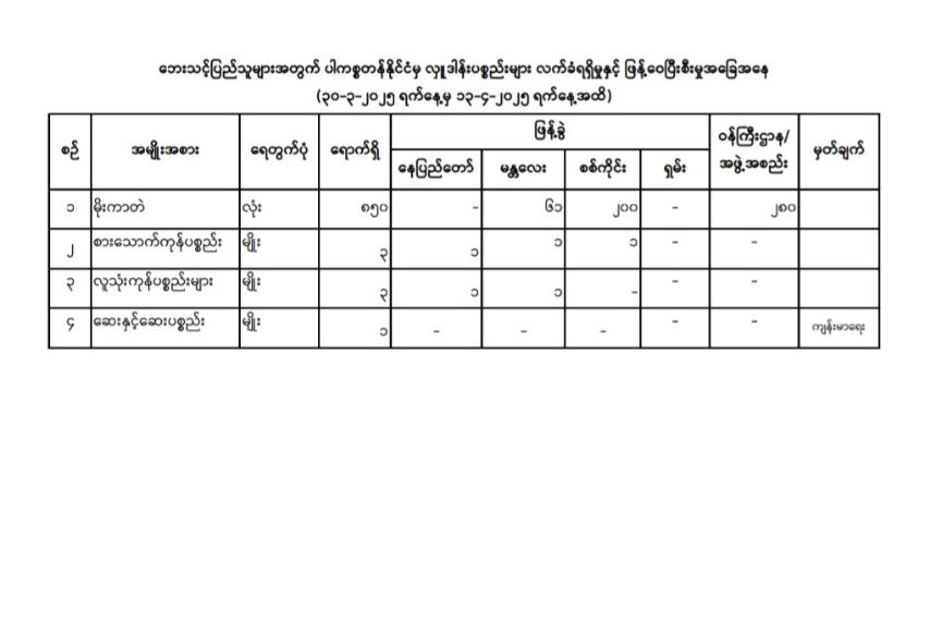 နိုင်ငံတကာအလှူရှင်များ၏ လှူဒါန်းပစ္စည်းများကို ပြည်ထောင်စုနယ်မြေ၊ နေပြည်တော်၊ မန္တလေးတိုင်းဒေသကြီး၊ စစ်ကိုင်းတိုင်းဒေသကြီး၊ ရှမ်းပြည်နယ် (တောင်ပိုင်း)ရှိ ဘေးသင့် ပြည်သူများအတွက် ဖြန့်ခွဲပေးပို့ထားမှုကို နောက်ဆက်တွဲပါဇယားများဖြင့် ပူးတွဲ၍ ဖော်ပြ အပ်ပါသည်။