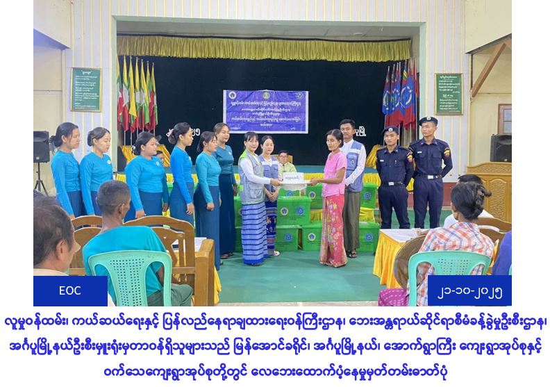 ရှမ်းပြည်နယ် (အရှေ့ပိုင်း)၊ မိုင်းဖြတ်မြို့နယ်၊ မိုင်းဖြတ်ကျေးရွာအုပ်စု ၊ ဟိုနား(ရှမ်း)ကျေးရွာ၌ (၇ .၆ .၂၀၂၁)ရက်နေ့ (၁၄:၀၀ ) နာရီ အချိန်ခန့်တွင် မိုးကြိုးထိမှန် သေဆုံးခဲ့သူ (၁)ဦးအတွက် ထောက်ပံ့ငွေ (၃၀၀၀၀၀ိ/)ကျပ်အား (၁၀.၆.၂၀၂၁) ရက်နေ့(၁၄:၀၀) အချိန်တွင် လူမှုဝန်ထမ်း၊ ကယ်ဆယ်ရေးနှင့် ပြန်လည်နေရာချထားရေးဝန်ကြီးဌာန၊ ဘေးအန္တရာယ်ဆိုင်ရာစီမံခန့်ခွဲမှုဦးစီးဌာန၊ မိုင်းဖြတ်မြို့နယ်ဦးစီးမှူးရုံး တာဝန်ရှိသူများက ၄င်း၏မိသားစုထံသို့ မြို့နယ်အထွေထွေအုပ်ချုပ်ရေးဦးစီးဌာန တာဝန်ရှိသူများနှင့်အတူ သွားရောက်ထောက်ပံ့ ပေးအပ်ခဲ့ပါသည်။