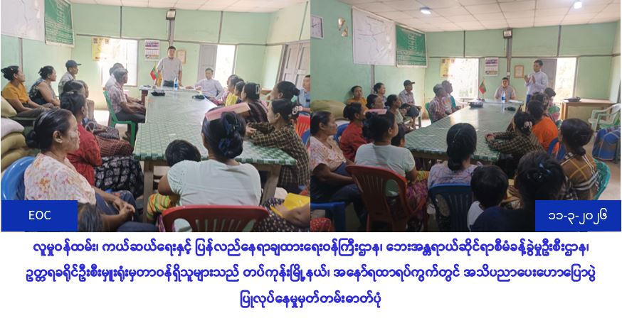 လူမှုဝန်ထမ်း၊ ကယ်ဆယ်ရေးနှင့်ပြန်လည်နေရာချထားရေးဝန်ကြီးဌာန၊ ဘေးအန္တရာယ်ဆိုင်ရာစီမံခန့်ခွဲမှုဦးစီးဌာန၊ ချောင်းဆုံမြို့နယ်ဦးစီးမှူးရုံးမှ တာဝန်ရှိသူများသည် ချောင်းဆုံမြို့နယ်၊ ညောင်လမ်းကျေးရွာအုပ်စု၌ (၆-၈-၂၀၂၂)ရက်နေ့တွင် ဖြစ်ပွားခဲ့သည့် မြေပြိုမှုကြောင့် ပြောင်းရွှေ့ခဲ့ရသည့် လူနေအိမ်(၉)လုံးအတွက် ပြောင်းရွှေ့စရိတ်(၉၀၀၀၀၀/-)နှင့် လူဦးရေ(၄၀)ဦးအတွက် (၇)ရက်စာဆန်ရိက္ခာဖိုးထောက်ပံ့ငွေ(၈၄၀၀၀/-)၊ စုစုပေါင်း(၉၈၄၀၀၀/-)အား (၈-၈-၂၀၂၂)ရက်နေ့၊ (၁၆:၀၀)နာရီအချိန်ခန့်တွင် မြို့နယ်စီမံအုပ်ချုပ်ရေးဖွဲ့နှင့်အတူ ဘေးသင့်ပြည်သူများလက်ဝယ်သို့ သွားရာက်ထာက်ပံ့ခဲ့ပါသည်။