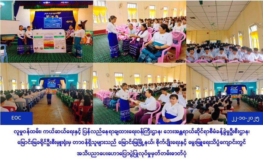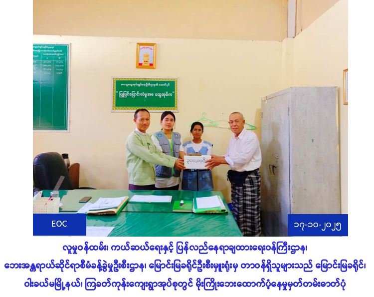 လူမှုဝန်ထမ်း၊ ကယ်ဆယ်ရေးနှင့် ပြန်လည်နေရာချထားရေးဝန်ကြီးဌာန၊ ဘေးအန္တရာယ်ဆိုင်ရာစီမံခန့်ခွဲမှုဦးစီးဌာန၊ ပဲခူးတိုင်းဒေသကြီး၊ သာယာဝတီခရိုင်ဦးစီးမှူးရုံးမှ တာဝန်ရှိသူများသည် (၂၈-၁၀-၂၀၂၁)ရက်နေ့(၀၄း၃၀)အချိန်၌ သာယာဝတီခရိုင်၊ မင်းလှမြို့နယ်၊လှည်းကူးကျေးရွာအုပ်စု၊ ရေကြည်ကျေးရွာတွင်ဖြစ်ပွားသောလေဘေးမှ တစ်စိတ်တစ်ပိုင်းပျက်စီးနေအိမ်(၁)လုံးအတွက် အိမ်ဆောက်ပစ္စည်းဖိုးထောက်ပံ့ငွေ(၃၀၀၀ဝိ/-)ကျပ်၊ အိမ်ထောင်စု(၁)စုရှိ လူဦးရေ(၆)ဦးတို့အတွက် ဆန်ဖိုးထောက်ပံ့ငွေ(၁၂၆၀၀ိ/-)၊ စုစုပေါင်းထောက်ပံ့ငွေ(၄၂၆၀၀ိ/-)တို့အား(၁-၁၁-၂၀၂၁)ရက်နေ့(၁၀းဝဝ)နာရီအချိန်တွင် မြို့နယ်အထွေထွေအုပ်ချုပ်ရေးဦးစီးဌာနမှ မြို့နယ်အုပ်ချုပ်ရေးမှူးနှင့်တာဝန်ရှိသူများ၊ ရပ်ကျေးစာရေး၊ ရပ်ကွက်/ကျေးရွာအုပ်ချုပ်ရေးမှူးများ၊ ရပ်မိ/ရပ်ဖများနှင့်အတူ ဘေးသင့်ပြည်သူများလက်ဝယ်အရောက် ထောက်ပံ့ပေးအပ်ခဲ့ပါသည်။