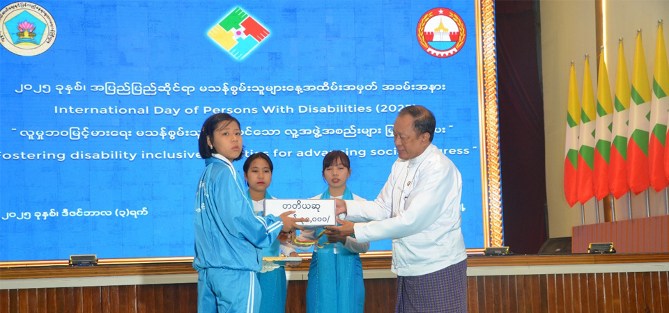၂၀၂၅ ခုနှစ်၊ အပြည်ပြည်ဆိုင်ရာမသန်စွမ်းသူများနေ့ အခမ်းအနားကို မန္တလေးတိုင်းဒေသကြီးအစိုးရအဖွဲ့မှ ဦးဆောင်၍  မန္တလေးမြို့တော်စည်ပင်ခန်းမတွင် ၃.၁၂.၂၀၂၅ ရက်၊ နံနက် (၀၉း၀၀) နာရီမှစတင်၍ ကျင်းပပြုလုပ်ခဲ့ရာ အဆိုပါ အခမ်းအနားသို့ မန္တလေးတိုင်းဒေသကြီးမသန်စွမ်းသူများအခွင့်အရေးများဆိုင်ရာ ကော်မတီ၊ ဥက္ကဋ္ဌ၊ တိုင်းဒေသကြီး အစိုးရအဖွဲ့၊ လူမှုရေးရာဝန်ကြီး ဦးအောင်ကျော်မိုးနှင့် တိုင်းဒေသကြီးအစိုးရအဖွဲ့ဝန်ကြီးများ၊ ဌာနဆိုင်ရာ အကြီးအကဲများ၊ မိခင်နှင့် ကလေးစောင့်ရှောက်မှုကြီးကြပ်ရေးအဖွဲ့၊ အမျိုးသမီးရေးရာကော်မတီမှ ဥက္ကဋ္ဌနှင့် အဖွဲ့ဝင်များ၊ လူမှုဝန်ထမ်းဦးစီးဌာန၊ မန္တလေးတိုင်းဒေသကြီး လူမှုဝန်ထမ်းဦးစီးမှူးရုံး ကြီးကြပ်မှုအောက်ရှိ မသန်စွမ်းကလေးများ သင်တန်းကျောင်းနှင့် နားမကြားသောကလေးများကျောင်းမှ ကျောင်းသား/ သူများနှင့် လူမှုဝန်ထမ်းဦးစီးဌာန အသိ အမှတ်ပြု မသန်စွမ်းပုဂ္ဂလိကကျောင်းများမှ ကျောင်းသား/ သူများ၊ မသန်စွမ်းဂေဟာမှ မသန်စွမ်းသူများတက်ရောက်၍ မန္တလေးတိုင်းဒေသကြီး မသန်စွမ်းသူများအခွင့်အရေးများဆိုင်ရာကော်မတီ၊ ဥက္ကဋ္ဌ၊ တိုင်းဒေသကြီးအစိုးရအဖွဲ့၊ လူမှုရေးရာဝန်ကြီး၊ ဦးအောင်ကျော်မိုးမှ အဖွင့်အမှာစကားပြောကြားပြီး၊ ၁.၁၂.၂၀၂၅ ရက်နှင့် ၂.၁၂.၂၀၂၅ ရက်တွင် ကျင်းပပြုလုပ်ခဲ့သော အကြိုလှုပ်ရှားမှု အားကစားပြိုင်ပွဲများတွင်ဆုရရှိခဲ့ကြသော မသန်စွမ်းသူများအား ဂုဏ်ပြုဆုငွေများပေးအပ်ခြင်းနှင့် ရွှေတံဆိပ်ဆု၊ ငွေတံဆိပ်ဆုများနှင့် ကြေးတံဆိပ်ဆုများအား ချီးမြှင့်ပေးအပ်ခဲ့ပြီး၊ UN-massage ဖွင့်လှစ်ပြသခြင်း၊ အပြည်ပြည်ဆိုင်ရာမသန်စွမ်းသူများနေ့ Video Clip ပြသခြင်းများပြုလုပ်၍ အခမ်းအနားသို့ တက်‌ရောက်လာသူဦးရေ ၃၀၀  ဖြင့် စည်းကားသိုက်မြိုက်အောင်မြင်စွာဖြင့် ကျင်းပပြုလုပ်နိုင်ခဲ့ပါသည်။