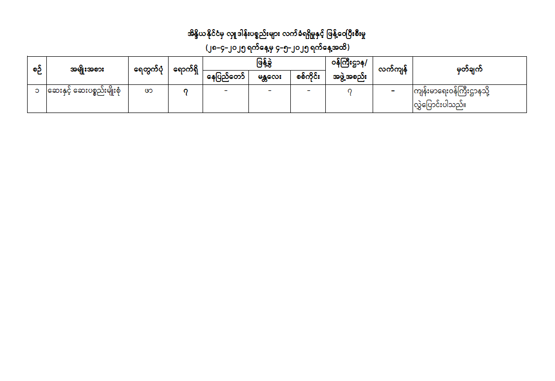 ယခုအခါ ဧပြီလ၂၈ရက်နေ့မှမေလ ၄ရက်နေ့အထိရက်သတ္တပတ်၁ပတ်အတွင်း အိန္ဒိယနိုင်ငံ၊ တရုတ်ပြည်သူ့သမ္မတနိုင်ငံနှင့် မလေးရှားနိုင်ငံတို့မှထပ်မံပေးပို့လှူဒါန်းလာသော မိုးကာတဲ၊ Sleeping Bags၊ စားသောက်ကုန်ပစ္စည်း၊ လျှပ်စစ်ပစ္စည်း၊ လူသုံးကုန်ပစ္စည်း၊ ဆေးနှင့်ဆေးပစ္စည်းများအနက်ဆေးနှင့်ဆေးပစ္စည်းများကို ကျန်းမာရေးစောင့်ရှောက်မှုလုပ်ငန်း ကော်မတီ (ကျန်းမာရေးဝန်ကြီးဌာန) သို့လွှဲပြောင်းပေးခဲ့ပြီးကျန်ပစ္စည်းများကို နေပြည်တော်နှင့် ရှမ်းပြည်နယ်တို့သို့ဘေးသင့်လူဦးရေအချိုးအစားအပေါ်မူတည်၍ ဖြန့်ခွဲပေးပို့လျက်ရှိပါသည်။ တရုတ်ပြည်သူ့သမ္မတနိုင်ငံမှ လှူဒါန်းမည့်ဒီဇယ်ဆီတန် ၃၀,၀၀၀၊ ဓာတ်ဆီတန် ၂၀,၀၀၀၊ ယာယီနေအိမ်အဖြစ်အသုံးပြုရန် Prefabricated House ၄၅၀၀ လုံးနှင့် ယာယီရုံးအဖြစ်အသုံးပြုရန် Prefabricated Office ၅၀၀ လုံးတို့အနက် ၂-၅-၂၀၂၅ ရက်နေ့တွင် ဒီဇယ်ဆီတန် ၁၈,၀၀၀နှင့် PrefabricatedOffice ၃၄၀ လုံးသည် ရန်ကုန်မြို့၊ သီလဝါ ဆိပ်ကမ်းသို့ရောက်ရှိခဲ့ရာဒီဇယ်ဆီတန် ၁၈,၀၀၀ ကိုရန်ကုန်မြို့၊ သီလဝါ Terminalတွင် ခေတ္တ ထိန်းသိမ်းထားရှိပြီးပြန်လည်ထူထောင်ရေးလုပ်ငန်းများတွင်အသုံးပြုသွားမည်ဖြစ်ပါသည်။ PrefabricatedOffice ၃၄၀ လုံးကို၄-၅-၂၀၂၅ ရက်နေ့တွင် နေပြည်တော်သို့ မြန်မာ့မီးရထားဖြင့် သယ်ဆောင်လျက်ရှိရာရောက်ရှိပါကဝန်ကြီးဌာနအသီးသီးသို့ ဖြန့်ခွဲ၍ ယာယီရုံခန်းများအဖြစ် အသုံးပြုကာဌာန၊ အဖွဲ့အစည်းအလိုက် လုပ်ငန်းများကိုဆောင်ရွက်သွားမည်ဖြစ်ပါသည်။
