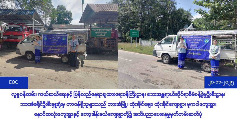 လှုမှုဝန်ထမ်း၊ ကယ်ဆယ်ရေးနှင့်ပြန်လည်နေရာချထားရေးဝန်ကြီးဌာန၊ ဘေးအန္တရာယ်ဆိုင်ရာစီမံခန့်ခွဲမှုဦးစီးဌာန၊ ပြည်ခရိုင်ဦးစီးမှူးရုံးမှတာဝန်ရှိသူများသည် (၁၀-၉-၂၀၂၁)ရက်နေ့တွင် နံနက်(၀၇:၃၀)အချိန်မှ (၁၂:၀၀)အချိန်အထိ ပြည်ခရိုင်၊ ပြည်မြို့နယ်၊ နဝဒေးရပ်ကွက်၊ ရွာဘဲရပ်ကွက်နှင့် နဝင်းရပ်ကွက်အတွင်း ကိုဗစ်-၁၉ လတ်တလော အသက်ရှူလမ်းကြောင်း ဆိုင်ရာရောဂါနှင့်ပတ်သက်၍ အများပြည်သူသိရှိလိုက်နာရန်အချက်များ၊ သဘာဝဘေးအန္တရာယ်ဆိုင်ရာအသိပညာပေးလုပ်ငန်းများ ဆောင်ရွက်ခဲ့ပြီး သဘာဝဘေးလက်ကမ်း စာစောင်နှင့် Surgical Mask များကို ဝေငှခဲ့ပါသည်။