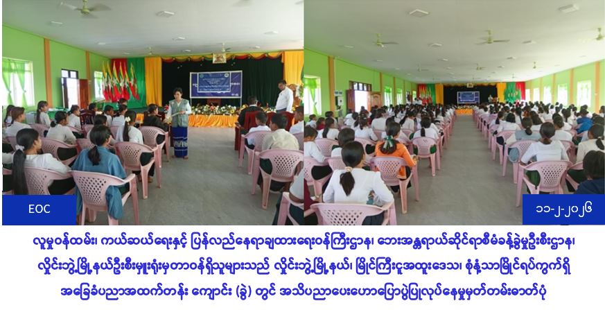 လူမှုဝန်ထမ်း၊ ကယ်ဆယ်ရေးနှင့် ပြန်လည်နေရာချထားရေးဝန်ကြီးဌာန၊ ဘေးအန္တရာယ်ဆိုင်ရာစီမံခန့်ခွဲမှုဦးစီးဌာန၊ လှိုင်းဘွဲ့ မြို့နယ်ဦးစီးမှူးရုံးမှ တာဝန်ရှိသူများသည် မြို့နယ်ရဲတပ်ဖွဲ့၊ မြို့နယ်လူမှုဝန်ထမ်းဦးစီးဌာန၊ မြို့နယ်ပြန်လည်ထူထောင်ရေးဦးစီး ဌာနတို့နှင့်ပူးပေါင်း၍ (၁၉-၆-၂၀၂၄)ရက်နေ့၊ (၁၀:၀၀) အချိန်မှ (၁၂:၀၀) အချိန်ထိ လှိုင်းဘွဲ့မြို့၊ ကွမ်တာကျေးရွာ၊ အခြေခံပညာ အထက်တန်းကျောင်း(ခွဲ)၌ ကျောင်းသား/သူ (၁၅၀)ဦးတို့အား လှိုင်းဘွဲ့မြို့နယ်ဦးစီးမှူးရုံးမှ သဘာဝဘေးအန္တရာယ်နှင့်ပတ်သက် ၍ ဆောင်ရန်/ရှောင်ရန်အချက်များ၊ သဘာဝပတ်ဝန်းကျင်ဆိုင်ရာကိစ္စရပ်များ၊ တောမီးအန္တရာယ်နှင့် ရာသီဥတုပြောင်းလဲမှုဆိုင်ရာ ကိစ္စရပ်များနှင့် ပတ်သက်သည့် အသိပညာပေးဟောပြောမှုများအားလည်းကောင်း၊ လူမှုဝန်ထမ်းဦးစီးဌာနမှ အမျိုးသမီးများနှင့် အရေးပေါ်အခြေအနေများဆိုင်ရာကိစ္စရပ်များအားလည်းကောင်း၊ ပြန်လည်ထူထောင်ရေးဦးစီးဌာနမှ မသန်စွမ်းသူများ၏ အခွင့် အရေးများဆိုင်ရာကိစ္စရပ်များအားလည်းကောင်း၊ မြို့နယ်ရဲတပ်ဖွဲ့မှ လူကုန်ကူးမှုတားဆီးကာကွယ်ရေးဆိုင်ရာ ကိစ္စရပ်များအား လည်းကောင်း ဟောပြောဆွေးနွေးခဲ့ပြီး ဘေး (၉) မျိုး အသိပညာပေးလက်ကမ်းစာစောင်ဖြန့်ဝေပေးခြင်း၊ ကျောင်းဝန်းအတွင်း၌ ဗီနိုင်းပိုစတာ ကပ်နိုင်ရေးအတွက် ငလျင်ဘေးအသိပညာပေး ဗီနိုင်းပိုစတာ ပေးအပ်ခြင်းများဆောင်ရွက်ခဲ့ပါသည်။