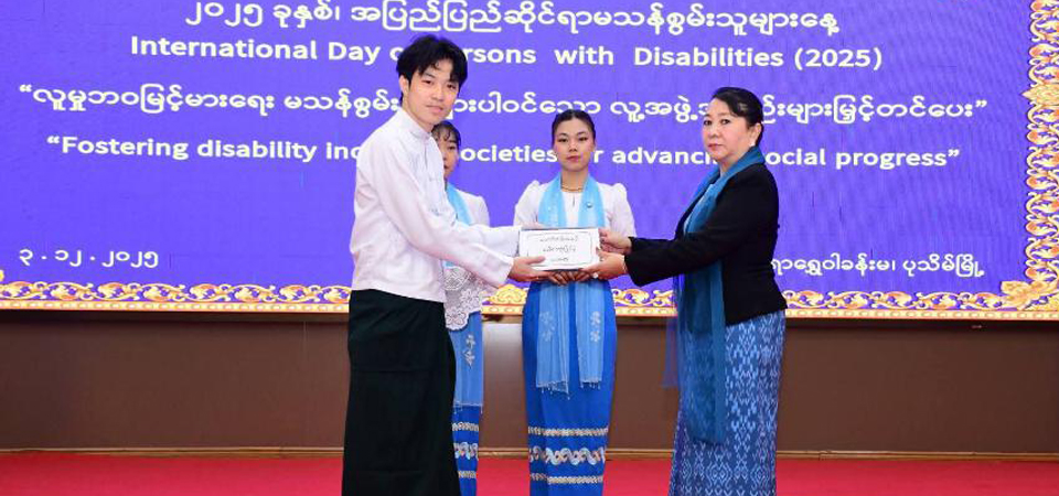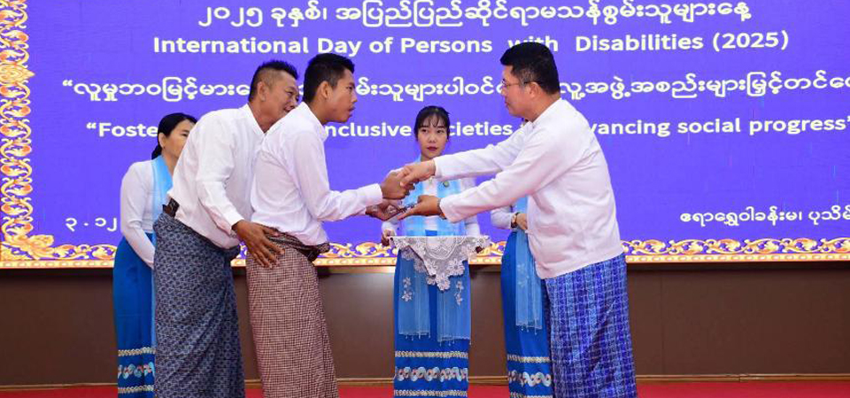 ပုသိမ်မြို့၊ ဧရာရွှေဝါခန်းမတွင် ၃.၁၂.၂၀၂၅ ရက်၌ကျင်းပပြုလုပ်သည့် အပြည်ပြည်ဆိုင်ရာ မသန်စွမ်းသူများနေ့ အထိမ်းအမှတ် အခမ်းအနားသို့ ဧရာဝတီတိုင်းဒေသကြီး အစိုးရအဖွဲ့ ဝန်ကြီးချုပ် ဦးတင်မောင်ဝင်းတက်ရောက်၍ အဖွင့်အမှာစကားပြောကြားခဲ့ပါသည်။ ဆက်လက်၍ တိုင်းဒေသကြီးဝန်ကြီးချုပ်နှင့် ဧည့်သည်တော်များသည် ကုလသမဂ္ဂအထွေထွေ အတွင်းရေးမှူးချုပ်မှ ပေးပို့သည့် အပြည်ပြည်ဆိုင်ရာမသန်စွမ်းသူများနေ့ သဝဏ်လွှာ Video Clip ပြသမှုနှင့် မြန်မာနိုင်ငံတွင်ဆောင်ရွက်လျက်ရှိသည့် မသန်စွမ်းသူများအရေးနှင့် ပတ်သက်သည့် Video Clip ပြသမှုများကို ကြည့်ရှုအားပေးခဲ့ပြီးနောက် တိုင်းဒေသကြီးဝန်ကြီးချုပ်က မသန်စွမ်းသူများအား နိုင်ငံသားစိစစ်ရေးကတ်များနှင့် ထိုင်းနိုင်ငံတွင် ကျင်းပမည့် အရှေ့တောင်အာရှ အားကစားပြိုင်ပွဲသို့ ဝင်ရောက်ယှဉ်ပြိုင်မည့် ဧရာဝတီတိုင်းဒေသကြီးမှ မသန်စွမ်းအားကစားသမားများအား ဂုဏ်ပြုငွေများကိုလည်းကောင်း၊ အပြည်ပြည်ဆိုင်ရာ မသန်စွမ်းသူများနေ့ အထိမ်းအမှတ်အကြို အခြေခံပညာအထက်တန်းအဆင့် စာစီစာကုံး ပြိုင်ပွဲတွင် ပထမ၊ ဒုတိယနှင့် တတိယဆုရရှိသူများအား တိုင်းဒေသကြီးအမျိုးသမီးရေးရာအဖွဲ့ နာယက၊ တိုင်းဒေသကြီးဝန်ကြီးချုပ်၏ဇနီးကလည်းကောင်း၊ အခြေခံပညာအလယ်တန်းအဆင့် စာစီစာကုံးပြိုင်ပွဲတွင် ပထမ၊ ဒုတိယနှင့် တတိယဆုရရှိသူများအား တိုင်းဒေသကြီး မသန်စွမ်းသူများ၏ အခွင့်အရေးများဆိုင်ရာကော်မတီ ဒုတိယဥက္ကဋ္ဌ၊ လူမှုရေးရာဝန်ကြီးက လည်းကောင်း ဆုများချီးမြှင့်ပေးအပ်ခဲ့ကြပြီး စုပေါင်းမှတ်တမ်းတင် ဓာတ်ပုံရိုက်ကူးခဲ့ကြပါသည်။