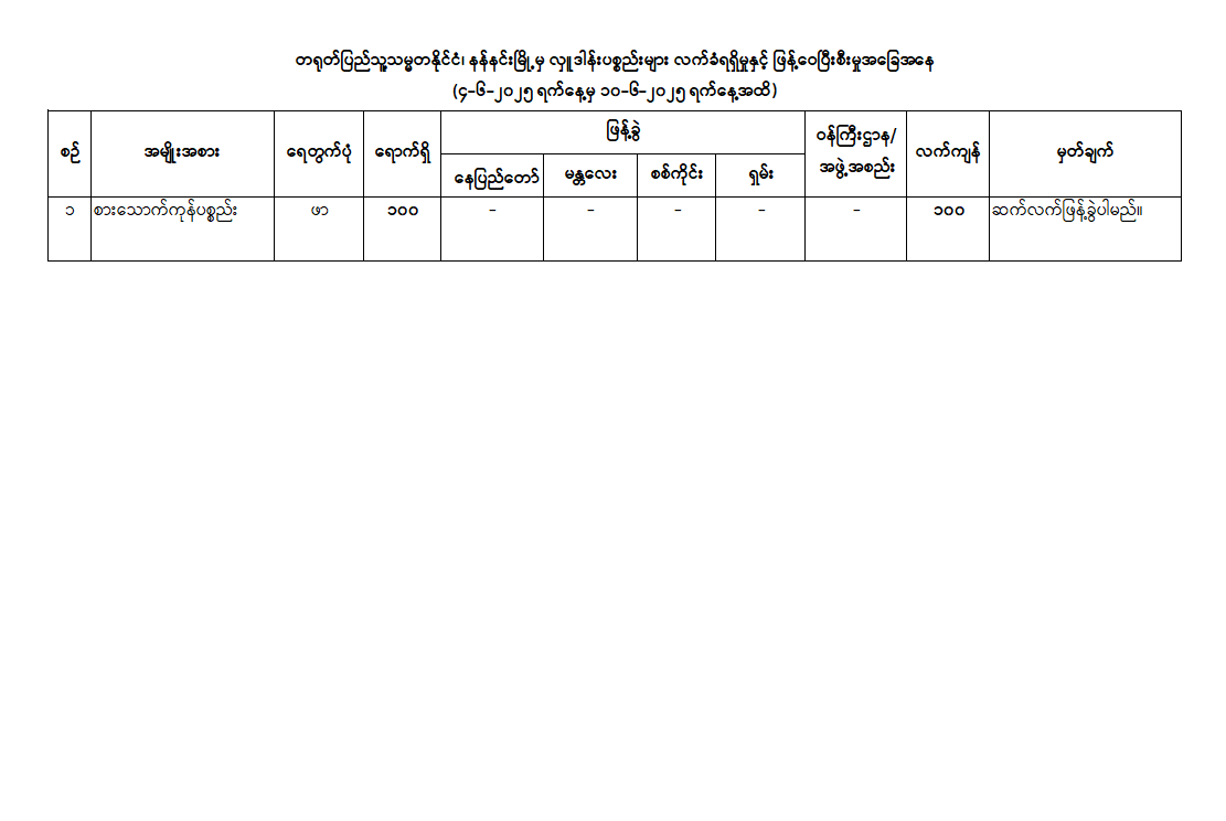 နိုင်ငံတကာအလှူရှင်များက၄-၆-၂၀၂၅ရက်နေ့မှ၁၀-၆-၂၀၂၅ရက်နေ့အထိရက်သတ္တပတ်၁ပတ်အတွင်းပေးပို့လှူဒါန်းသည့်ပစ္စည်းများအားဘေးသင့်ပြည်သူများအတွက်ဖြန့်ခွဲပေးပို့နိုင်ရေး ဆောင်ရွက်ထားရှိမှုကိုပူးတွဲပါဇယားများဖြင့်ဖော်ပြအပ်ပါသည်။