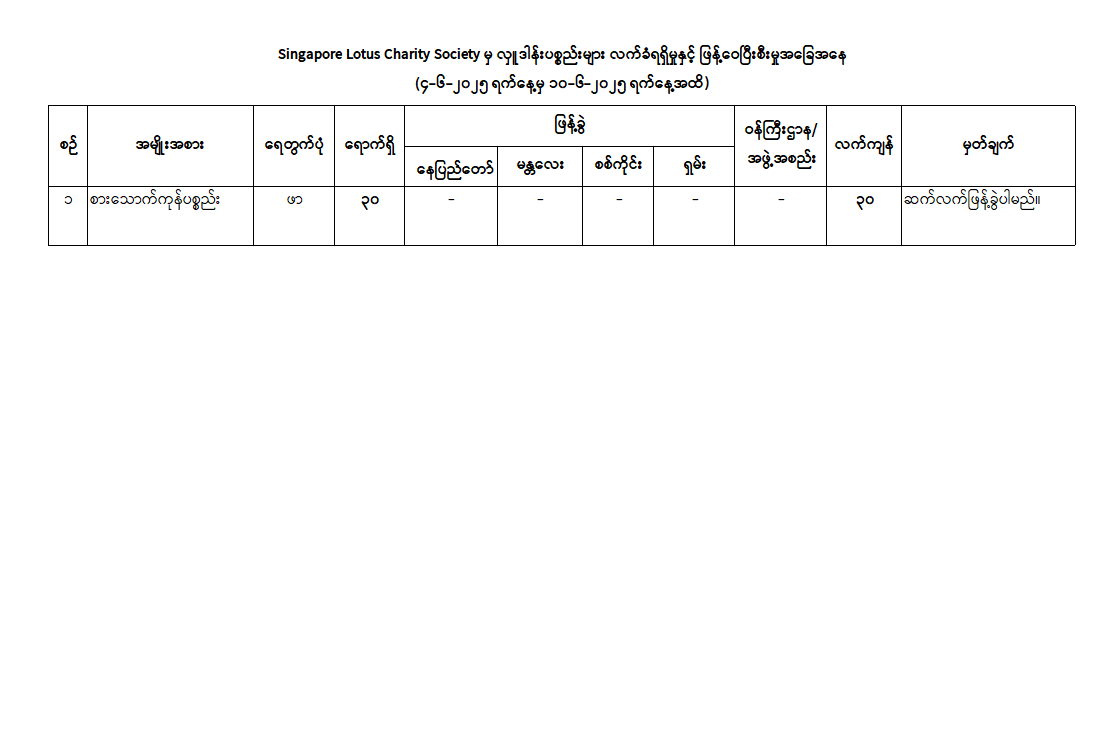 ယခုအခါဇွန်လ၄ရက်နေ့မှ၁၀ရက်နေ့အထိရက်သတ္တပတ်၁ပတ်အတွင်းအိန္ဒိယ နိုင်ငံ၊ ဗီယက်နမ်နိုင်ငံ၊ မလေးရှားနိုင်ငံ၊ တရုတ်နိုင်ငံ၊ နန်နင်းမြို့နှင့် Singapore Lotus Charity Society တို့မှထပ်မံပေးပို့လှူဒါန်းလာသောစားသောက်ကုန်၊ ဆေးနှင့်ဆေးပစ္စည်းများအနက်ဆေးနှင့် ဆေးပစ္စည်းများကိုကျန်းမာရေးစောင့်ရှောက်မှုလုပ်ငန်းကော်မတီ (ကျန်းမာရေးဝန်ကြီးဌာန)သို့ လွှဲပြောင်းပေးခဲ့ပြီးကျန်စားသောက်ကုန်များကို ဆောလျင်စွာဆက်လက်ဖြန့်ခွဲဆောင်ရွက်သွားမည် ဖြစ်ပါသည်။