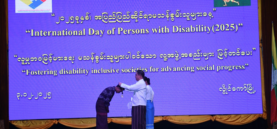 ယင်းနောက် ပြည်နယ်ဝန်ကြီးချုပ်နှင့် တာဝန်ရှိသူများက အပြည်ပြည်ဆိုင်ရာ မသန်စွမ်းသူများနေ့ အထိမ်းအမှတ် အားကစားပြိုင်ပွဲများဖြစ်သည့် သံလုံးပစ်၊ လှံတံပစ် ပြိုင်ပွဲများတွင် ဆုရရှိကြသည့် မသန်စွမ်းသူများအား ဆုများနှင့် အားကစားပြိုင်ပွဲ တွင်ပါဝင်ယှဉ်ပြိုင်ခဲ့ကြသည့် မသန်စွမ်းသူ (၈၂)ဦးတို့အား  အနွေးအင်္ကျီများ အသီးသီး ချီမြှင့်ပေးအပ်ခဲ့ကြသည်။ ထို့နောက် ပြည်နယ်ဝန်ကြီးချုပ်နှင့် အခမ်းအနားသို့ တက်ရောက်လာကြသူများက အပြည်ပြည်ဆိုင်ရာမသန်စွမ်းသူများနေ့ Video Clipအား ကြည့်ရှုခဲ့ကြသည်။