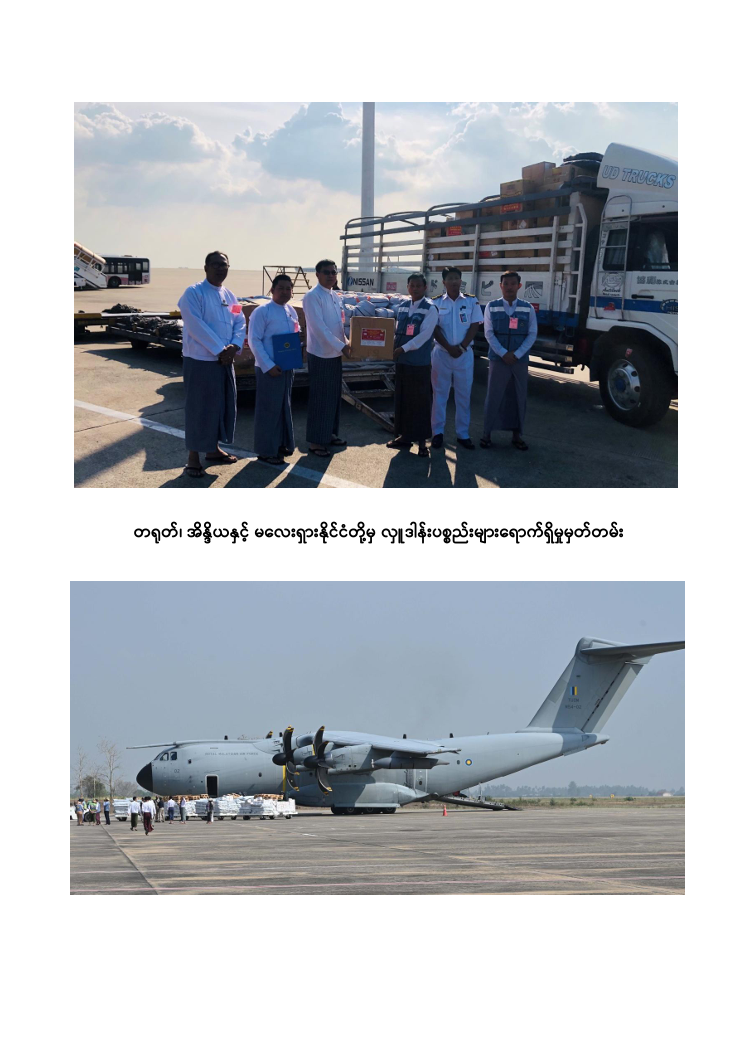 ယခုအခါ ဧပြီလ၂၈ရက်နေ့မှမေလ ၄ရက်နေ့အထိရက်သတ္တပတ်၁ပတ်အတွင်း အိန္ဒိယနိုင်ငံ၊ တရုတ်ပြည်သူ့သမ္မတနိုင်ငံနှင့် မလေးရှားနိုင်ငံတို့မှထပ်မံပေးပို့လှူဒါန်းလာသော မိုးကာတဲ၊ Sleeping Bags၊ စားသောက်ကုန်ပစ္စည်း၊ လျှပ်စစ်ပစ္စည်း၊ လူသုံးကုန်ပစ္စည်း၊ ဆေးနှင့်ဆေးပစ္စည်းများအနက်ဆေးနှင့်ဆေးပစ္စည်းများကို ကျန်းမာရေးစောင့်ရှောက်မှုလုပ်ငန်း ကော်မတီ (ကျန်းမာရေးဝန်ကြီးဌာန) သို့လွှဲပြောင်းပေးခဲ့ပြီးကျန်ပစ္စည်းများကို နေပြည်တော်နှင့် ရှမ်းပြည်နယ်တို့သို့ဘေးသင့်လူဦးရေအချိုးအစားအပေါ်မူတည်၍ ဖြန့်ခွဲပေးပို့လျက်ရှိပါသည်။ တရုတ်ပြည်သူ့သမ္မတနိုင်ငံမှ လှူဒါန်းမည့်ဒီဇယ်ဆီတန် ၃၀,၀၀၀၊ ဓာတ်ဆီတန် ၂၀,၀၀၀၊ ယာယီနေအိမ်အဖြစ်အသုံးပြုရန် Prefabricated House ၄၅၀၀ လုံးနှင့် ယာယီရုံးအဖြစ်အသုံးပြုရန် Prefabricated Office ၅၀၀ လုံးတို့အနက် ၂-၅-၂၀၂၅ ရက်နေ့တွင် ဒီဇယ်ဆီတန် ၁၈,၀၀၀နှင့် PrefabricatedOffice ၃၄၀ လုံးသည် ရန်ကုန်မြို့၊ သီလဝါ ဆိပ်ကမ်းသို့ရောက်ရှိခဲ့ရာဒီဇယ်ဆီတန် ၁၈,၀၀၀ ကိုရန်ကုန်မြို့၊ သီလဝါ Terminalတွင် ခေတ္တ ထိန်းသိမ်းထားရှိပြီးပြန်လည်ထူထောင်ရေးလုပ်ငန်းများတွင်အသုံးပြုသွားမည်ဖြစ်ပါသည်။ PrefabricatedOffice ၃၄၀ လုံးကို၄-၅-၂၀၂၅ ရက်နေ့တွင် နေပြည်တော်သို့ မြန်မာ့မီးရထားဖြင့် သယ်ဆောင်လျက်ရှိရာရောက်ရှိပါကဝန်ကြီးဌာနအသီးသီးသို့ ဖြန့်ခွဲ၍ ယာယီရုံခန်းများအဖြစ် အသုံးပြုကာဌာန၊ အဖွဲ့အစည်းအလိုက် လုပ်ငန်းများကိုဆောင်ရွက်သွားမည်ဖြစ်ပါသည်။