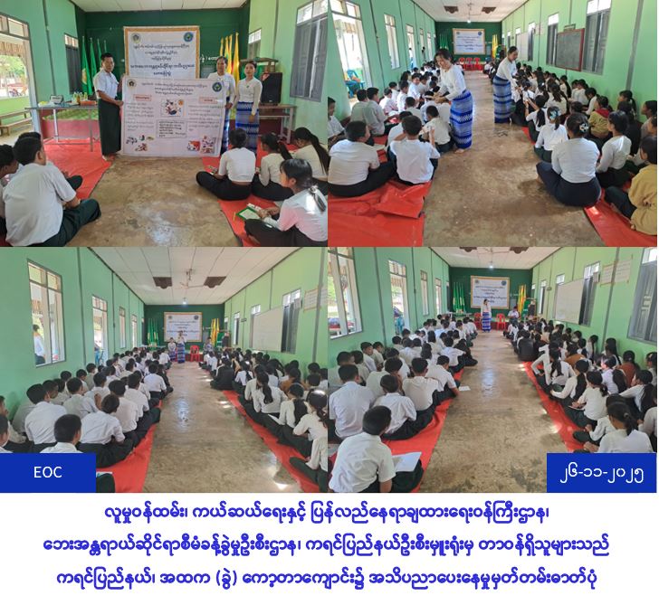 ဦးစီးဌာန(၃)ခု ပူးပေါင်း၍( Quick _Win Projet)ဖြင့် အသိပညာပေးဟောပြောပွဲကို အခြေခံပညာအထက်တန်းကျောင်း(ကတ္တလူ)တွင် (၅.၈.၂၀၂၂)ရက်နေ့ နေ့လည် (၁၃:၀၀) အချိန်၌ ကျောင်းသား၊