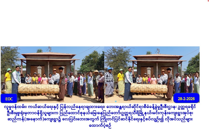 လူမှုဝန်ထမ်း၊ ကယ်ဆယ်ရေးနှင့် ပြန်လည်နေရာချထားရေး၊ ဘေးအန္တရာယ်ဆိုင်ရာစီမံခန့်ခွဲမှုဦးစီး ဌာန၊ ဥတ္တရခရိုင်ဦးစီးမှူးရုံးမှ တာဝန်ရှိသူများသည် ပြည်ထောင်စုနယ်မြေ၊ နေပြည်တော်၊ ဥတ္တရခရိုင်၊ တပ်ကုန်းမြို့နယ်၊ ညောင်ကိုင်းကျေးရွာအုပ်စု၊ မြောက်ရွေးစုကျေးရွာ၌ (၂၈-၂-၂၀၂၆)ရက်နေ့(၁၂း၁၅) အချိန်ခန့်တွင် ဖြစ်ပွားခဲ့သော မီးဘေးကြောင့် လုံးဝပျက်စီးခဲ့သော လူနေအိမ် (၁)လုံးအတွက် အိမ်ဆောက်ပစ္စည်းဖိုးထောက်ပံ့ငွေ (၁၀၀၀၀၀ိ/-)ကျပ်၊ ဘေးသင့်လူဦးရေ(၁)ဦးအတွက် ဆန်ရိက္ခာဖိုးထောက်ပံ့ငွေ (၅၀၀၀ိ/-)၊ စုစုပေါင်းထောက်ပံ့ငွေ (၁၀၅၀၀ဝိ/-)ကျပ်တို့အား (၁-၃-၂၀၂၆)ရက်နေ့၊ (၁၃း၀၀)အချိန်တွင် မြို့နယ်အထွထွေအုပ်ချုပ်ရေးဦးစီးဌာနမှ တာဝန်ရှိသူများ၊ကျေးရွာအုပ်ချုပ်ရေး မှူးများနှင့်အတူ ဘေးသင့်ပြည်သူများလက်ဝယ်သို့ သွားရောက်ထောက်ပံ့ခဲ့ပါသည်။